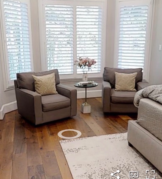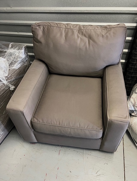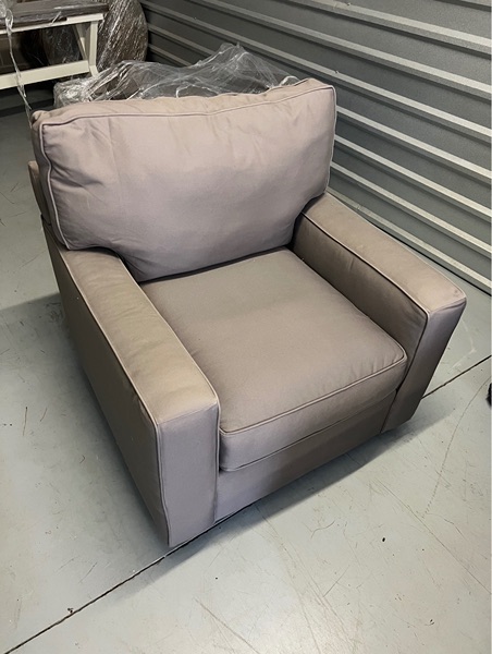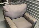 A set of 2 large grey twill Pottery Barn swivel chairs. In excellent condition.