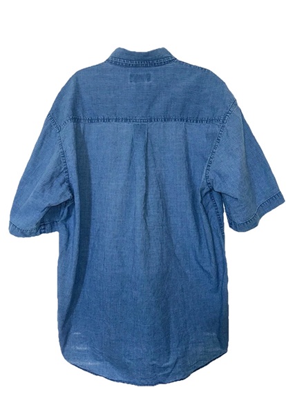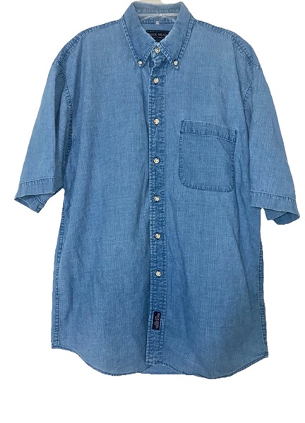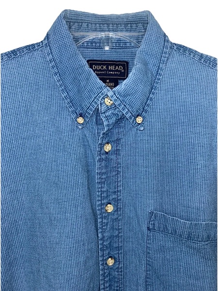 Vintage late ‘90s/early 2000s men’s medium short sleeve button up 100% cotton blue shirt from Duck Head Apparel Company. Features button down collar, wood toned buttons, left chest pocket, mini checked pattern, and front tag/logo beneath the column of buttons. Shirt is in overall good condition, meaning no stains, tears, holes, rips, or odors; all seams are intact; all buttons are present. However, shirt does have wear/fading you might expect from an item this age. The fading is mainly evident along the top of the collar and the right arm seam in the front. This is evident in the pictures of the shirt lying flat. I feel like it’s more subtle and not quite as obvious in real life than it appears in the pictures. $5