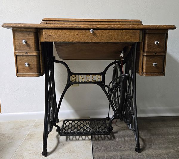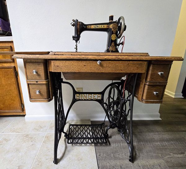 This Singer Treadle Sewing Machine has been well cared for, is complete and is fully operational. The sewing machine is beautifully accented with a gold leaf scroll motif and is housed in a beautiful walnut cabinet. This machine has always been in a smoke-free environment. Included is a new leather belt and some additional accessories. The drawer knobs are not original but wooden replacements can be found. The price is $550 - cash only. If interested text or call the number below. Thank you.