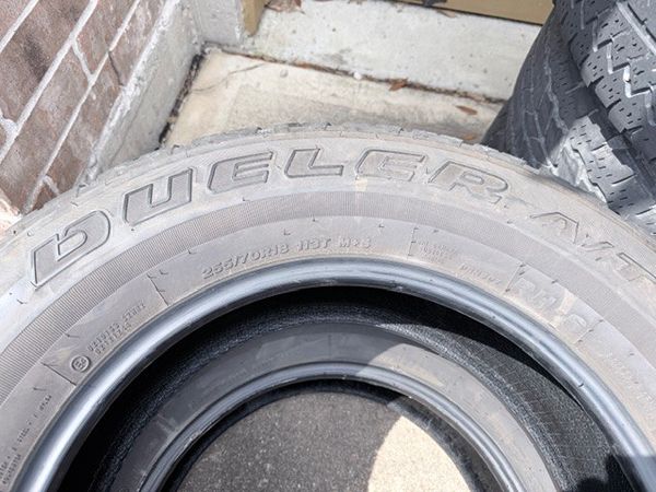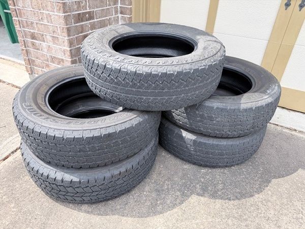 Selling 4 Bridgestone Dueler AT Tires (255/70R18 113T) for $150 OBO. These tires have substantial tread left on them. The tire on top of the stack is slightly different than the others (older/newer model) and it also has a nail in the tread, although I believe its in a repairable area, so I'm throwing it in as a bonus spare tire. I'm willing to meet a serious buyer within a 15 minute drive from the Rayford / Hwy 99 area, otherwise pickup will be necessary.