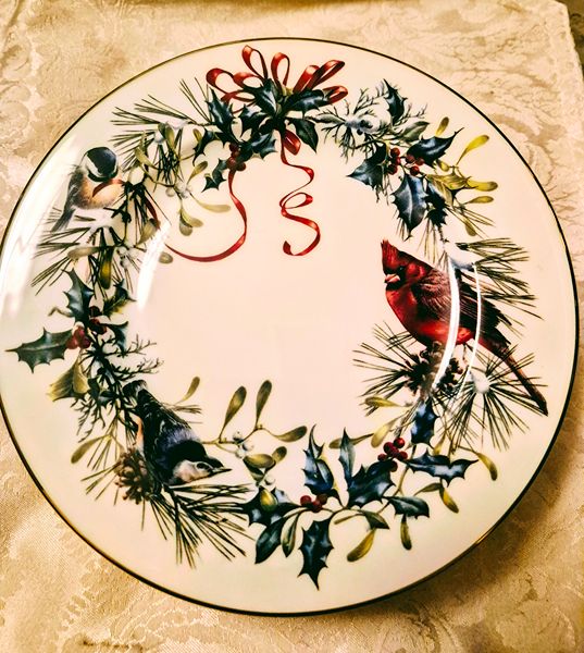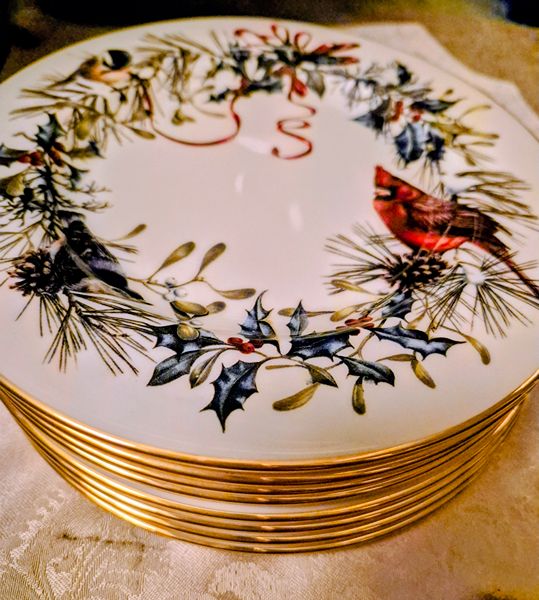 8 never used beautiful like new Lenox Winter Greetings salad plates. Online plates sell around $15 each. Lenox stamp on back, woodland/birds holiday motif with gold rim. Cash only.