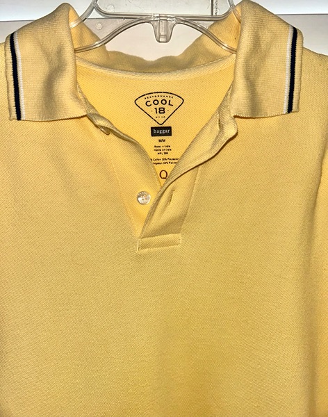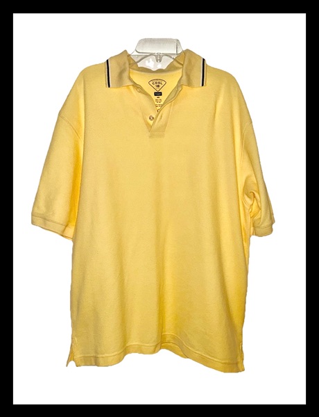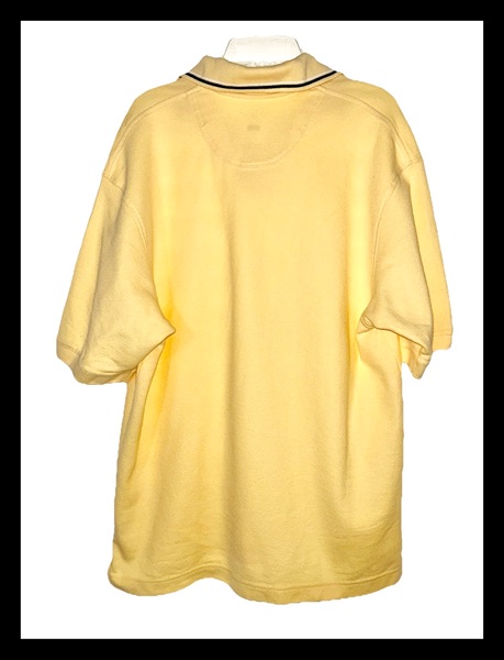 Vintage Y2K era men’s medium Haggar Cool 18 performance wear polo, 70% cotton 30% polyester. This is a Q product, meaning it carries Haggar’s Quality For Life Guarantee. It features a 2 button placket, a stripe-trimmed collar, ribbed cuff sleeves, and split hems. It’s in overall good condition with light wear and a TINY spot on the upper left shoulder. This is pictured above the number one on the close up of the measuring tape. The color is light yellow. I feel like it appears brighter in the first 2 hanging pictures than it is in real life. Smoke free home. $5