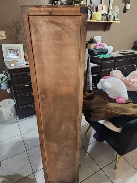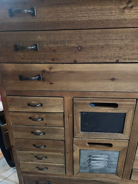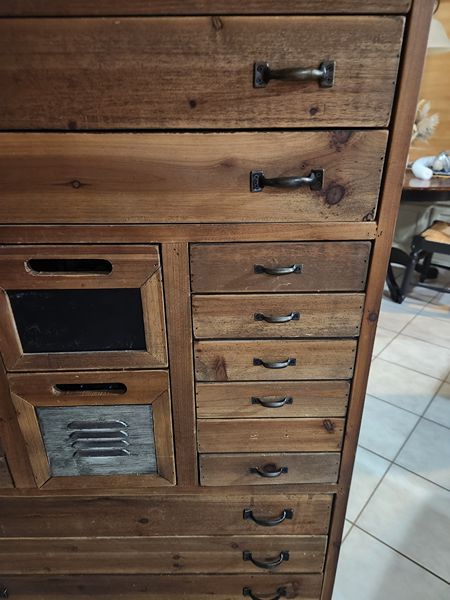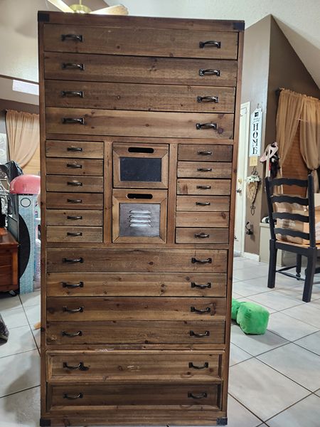 Selling a dresser with multiple small drawers. Dimensions are 57 3/4 X 27 1/2 X 12 1/2 inches.