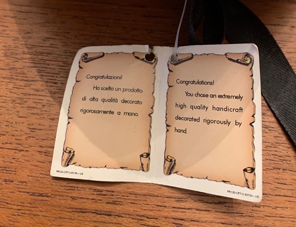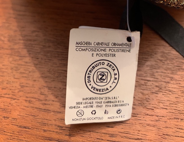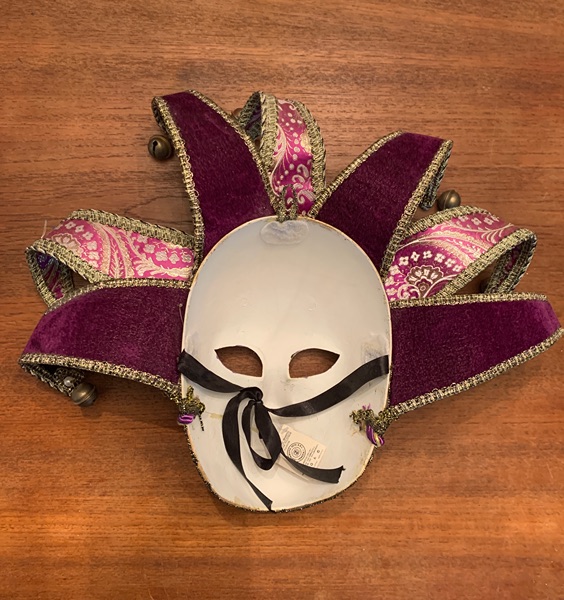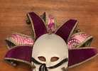 Beautifual Mardi Gras (Carnival) Jolly Mask from Venice, Italy. Beautiful craftmanship consisting of a hand painted polyester Court Jester face surrounded by bell-tipped points featuring intricate gold colored lace embroidery work that alternates between a deep purple velvet and a purple/gold paisley pattern. Suitable for wearing during Mardi Gras or for a wall display. Purchased in Venice, Italy in 2015. Thank you.