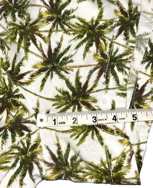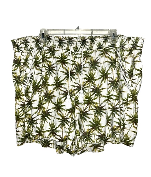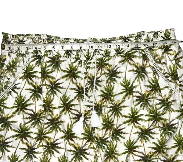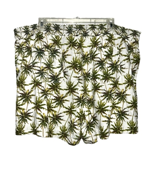 Briggs brand linen blend shorts, size XXL, with all-over palm tree design. These feature elastic pull string waist with front tassels; 2 front slash pockets with trim detail; 2 back pockets; and a 4.5 inch inseam. They are in overall very good condition from smoke free home with no known flaws. The fabric is off-white with a mixture of browns and greens. $8