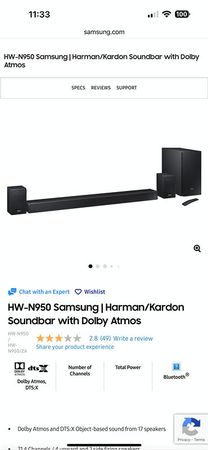 Lightly used Samsung N950 (first gen for Q television systems) 7.1.4 Soundbar plus wireless rear speakers, wireless sub woofer, plus speaker stands. All in immaculate shape... I ended up upgrading to a Sonos system. Has been well stored with no blemishes. Works perfectly and sounds AMAZING! Particularly in an apartment environment, but also able to fill a large room!