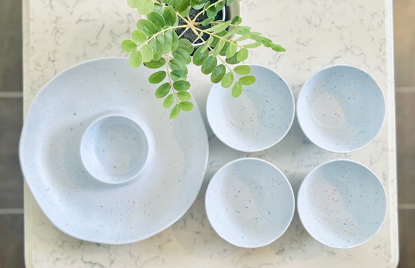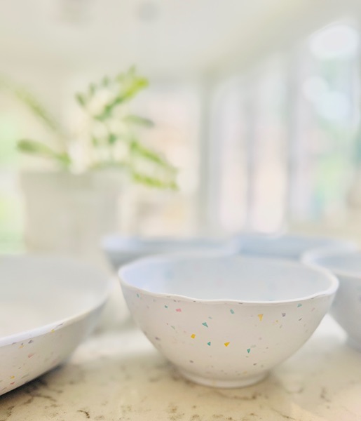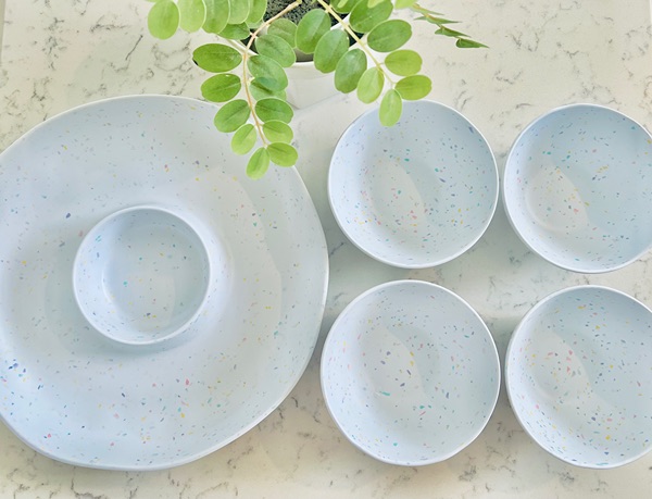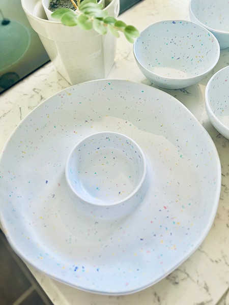 Used once for an event. Great for outdoor summer dining! Includes a large chip and dip and four matching bowls. Microwave and dishwasher safe, not breakable. $10 for all, porch pickup in The Woodlands.