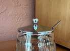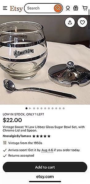 This vintage Sweet 'N Low sugar bowl set was made by Libbey in the 1960s. It includes the chrome lid and spoon. It's a charming nostalgic and unique piece, that's sure to get attention.