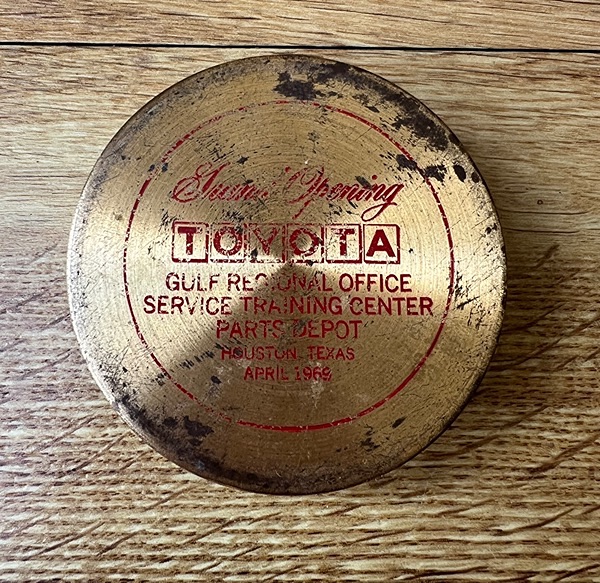 This vintage Toyota Gulf Regional Office Service Training Center Parts Depot commemorative brass magnifying glass is a collectible memorabilia piece from Houston, Texas, dating to April 1969.