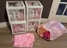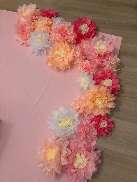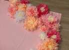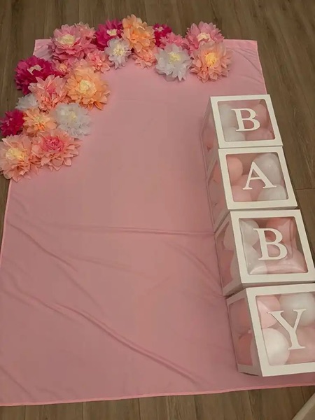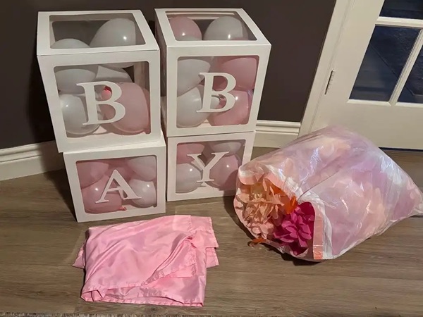 Includes pink photo back drop, 24 tissue paper flowers, and BABY letter blocks.**Balloons are deflated now. Will need new balloons.