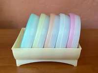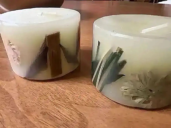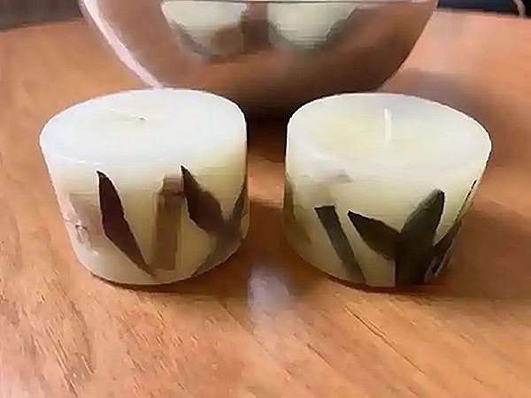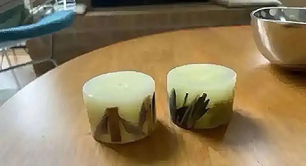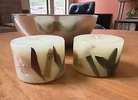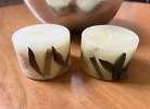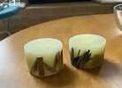 Candles are new and smell lovely but I don’t remember the name (I’d guess maybe Magnolia, Eucalyptus and a tad of Vanilla). About 2 1/2” diameter x 2” tall…$10 total, firm