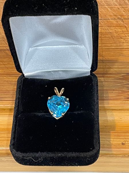 Family selling mother's jewelry have a very nice Blue topaz Heart Pendant approx size is 12X12 MM not lab created noted. family is down sizing willing to negotiate price for serious inquuiry only. Must meet up at a bank america lobby to be seen as required for showing. Please call Rocky A. at 936 442 1117 or Email noted in Ad. Purchased at Macy's back in 1986 yr. long Island,NY thankyou.