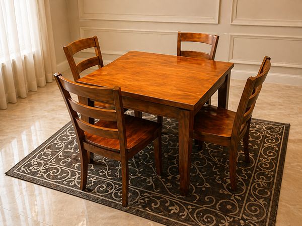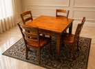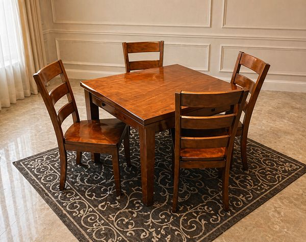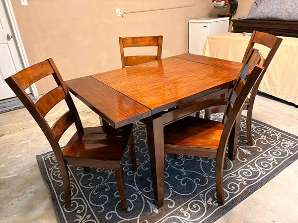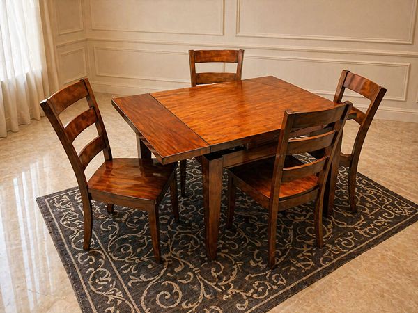 Add timeless sophistication to your dining area with this beautiful, pre-owned solid wood set. The unique lateral expandable table easily transitions from square measures: Without Extensions (Square): 36" L x 36" W x 31.5" H, With Extensions (Rectangular): 54" L x 36" W x 31.5" H. Offering flexible seating. Crafted with heavy finest wood construction and a rich, durable finish. This set includes four (4) matching, robust ladder-back chairs with the original flat-slat design, perfect for any fine dining experience. Pickup: Local pickup only. Serious inquiries please message for more details.