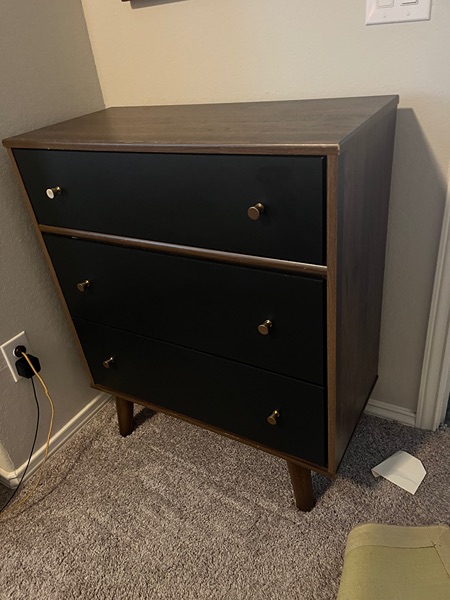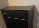 Great dresser, black and wood toned so will go with most decor. Small size makes it versatile. Measuring 36.5 inches high by 32.25 inches wide and 15 inches deep. Priced to sell!
