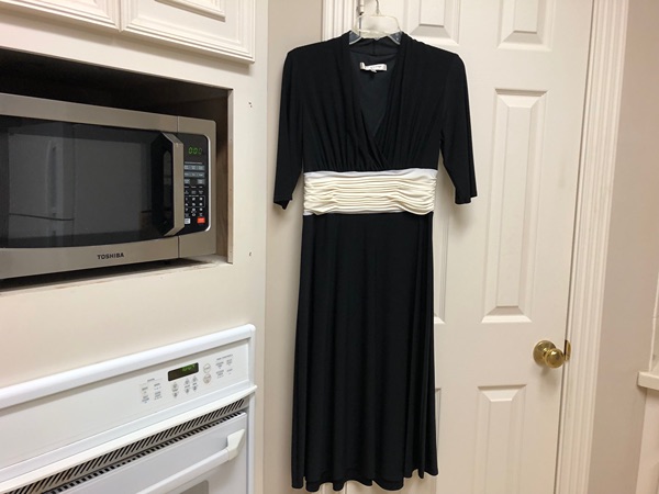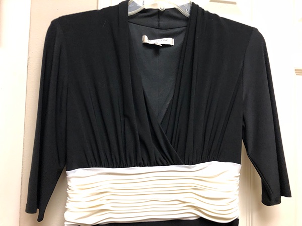 Size 8. Black with white cummerbund. Three quarter length sleeves. Very good condition. Classic look. Asking $10.00.