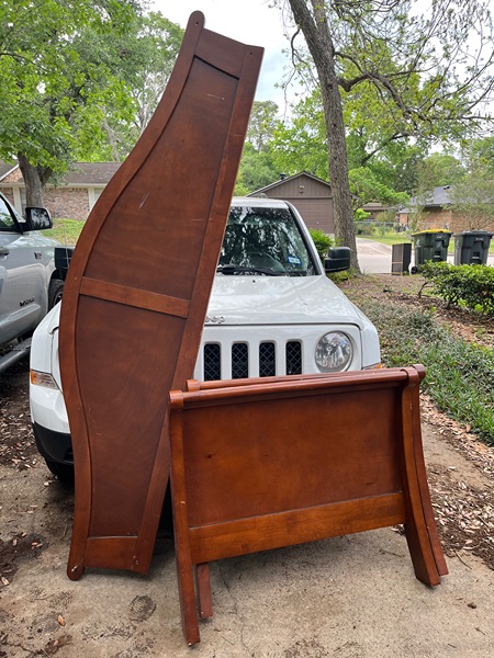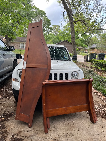 Twin size solid wood sleigh bed. Beautiful bed in great condition. It has a few scuffs but they'll polish out easily. I misplaced the hardware but they were standard bolts and screws