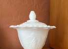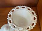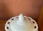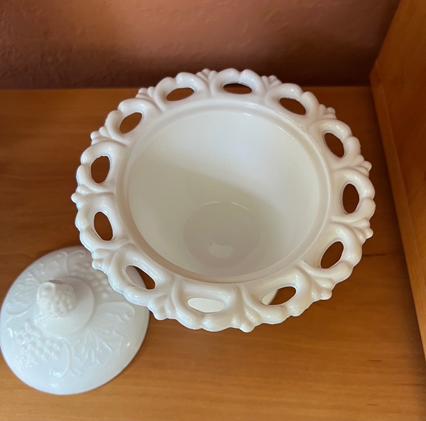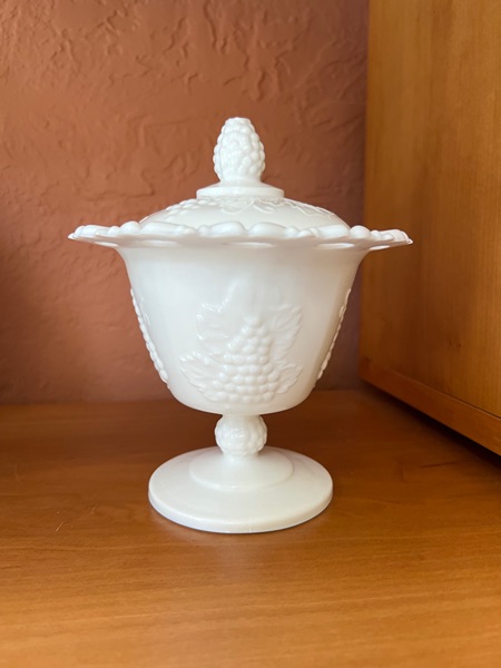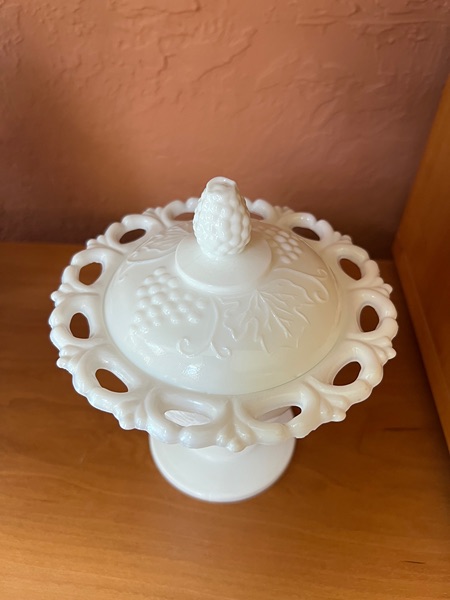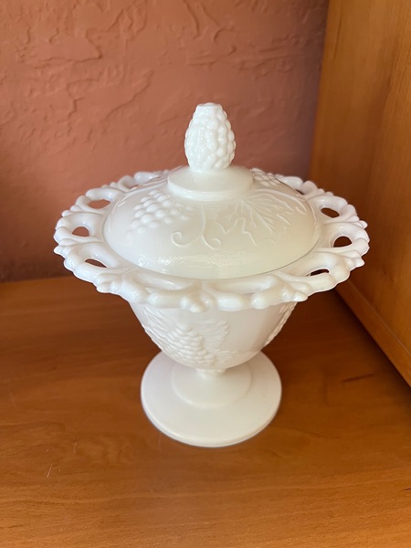 This is a Vtg. Indiana Glass Open Lace Milk Glass Grape Pattern Footed Compote with Lid. It measures 6 3/4" high with the lid and 5 3/4" in diameter. The piece is in good overall condition with minor signs of wear consistent with its age and use. Dimensions 5.75"W × 5.75"D × 6.75"H...$15 firm