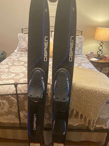 O'Brien Celebrity 68 inch Combo waterskis color black with royal blue trimming X-7 Bindings that fits men's size 4.5 to 13 only used twice so in great condition