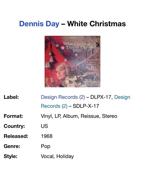 Vintage Christmas vinyl from the Dennis Day orchestra and choir, 1968. The jacket shows age, fading, and wear. The record has a few marks on it. However, the sound quality is excellent and record plays perfectly with no skips. $5