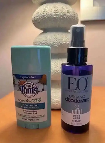 Tom's of Maine Sensitive Care Deodorant Stick and EO Organic Deodorant Spray.