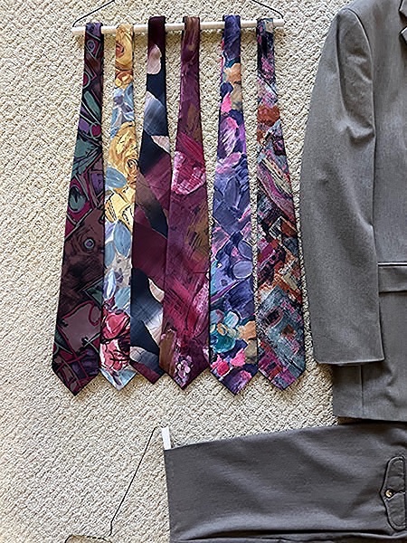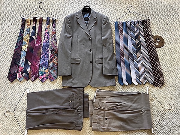 Gray suit jacket (40 long) with assorted ties (15 total!) and two pairs of pants (33 waist)…$20 total, firm