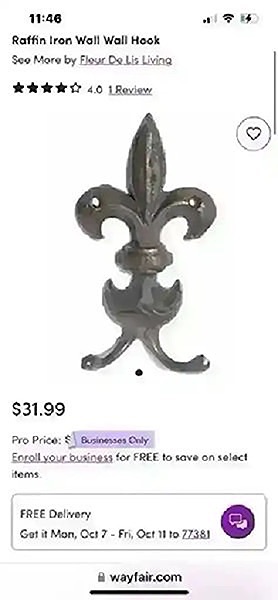 Wrought iron (painted iron) Fleur-de-Lis wall hook that could use more paint or leave it “distressed”.