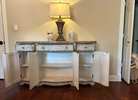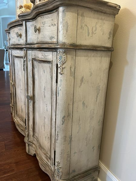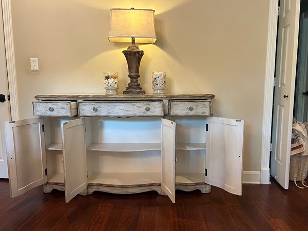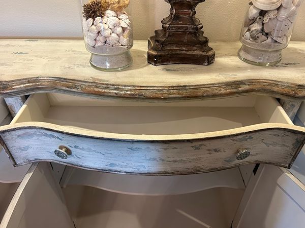 - Rustic and worn, this console has a comfortable feel. The distressed Finish accentuates framed door fronts and shaped front and Top.