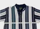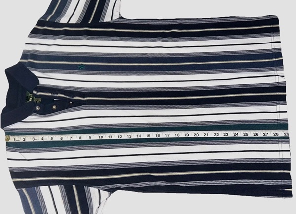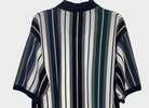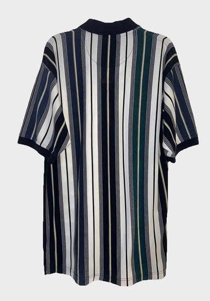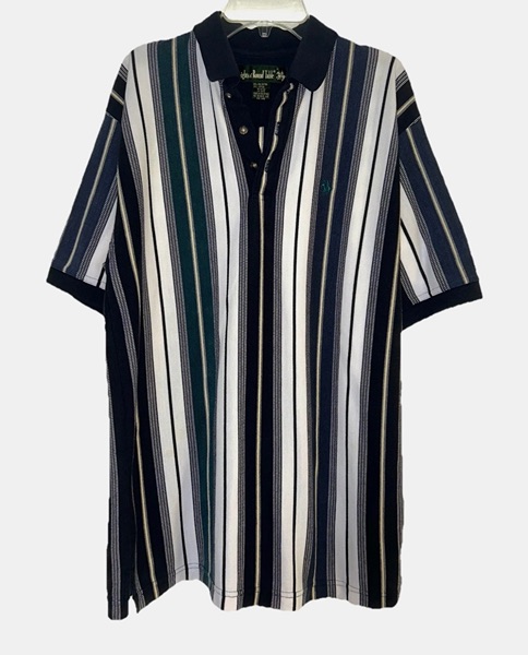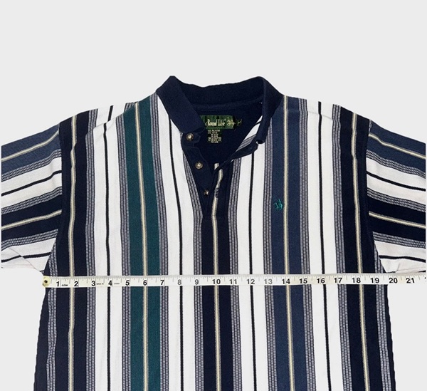 Vintage men’s medium vertical multicolor (green, blues, yellow) striped short sleeve polo from mid-late 90s/Y2K. Has 3 button placket; navy trim on collar, placket, and sleeves; green embroidered logo on left chest; ribbed collar and sleeve cuffs; and split hems. No known major flaws, but the thread in the semicircle trim on the upper back is a little loose in one spot (pictured) and there’s light fading/wear. Overall, still in very good condition, especially considering age, from smoke free home. $10
