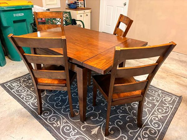 Add timeless sophistication to your dining area with this beautiful, pre-owned solid wood set. The unique lateral expandable table easily transitions from square measures: Without Extensions (Square): 36" L x 36" W x 31.5" H, With Extensions (Rectangular): 54" L x 36" W x 31.5" H. Offering flexible seating. Crafted with heavy finest wood construction and a rich, durable finish. Like any used furniture, it has minor cosmetic imperfections, but structurally table and chairs are solid as a rock. This set includes four (4) matching, robust ladder-back chairs with the original flat-slat design, perfect for any fine dining experience. Compare retail Price.Purchase in Star Fruniture.