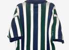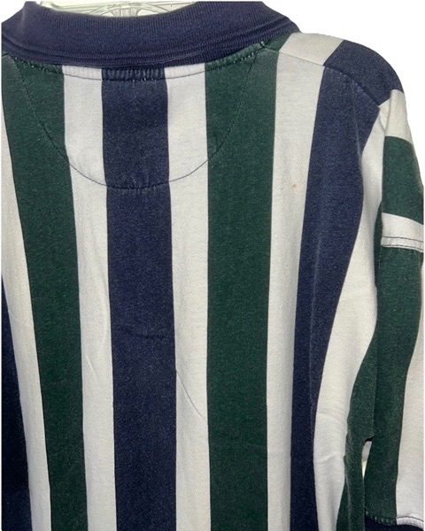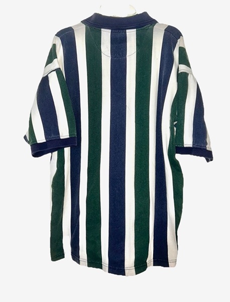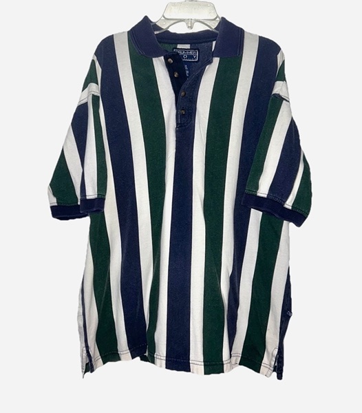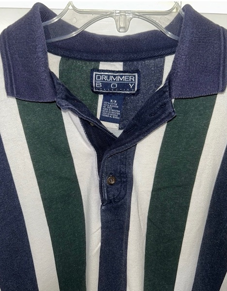 Vintage men’s Drummer Boy polo, collection series, size medium, short sleeves, most likely from mid to late ‘90s. Features thick green and blue vertical stripes, a 4-button placket, blue collar, blue placket trim, blue sleeve trim. It’s 100% cotton. Shirt has some color fading on the stripes and a small spot on back right shoulder blade area. However, seams are intact and there are no known holes, tears, or rips. Overall good condition from smoke free home. $8