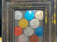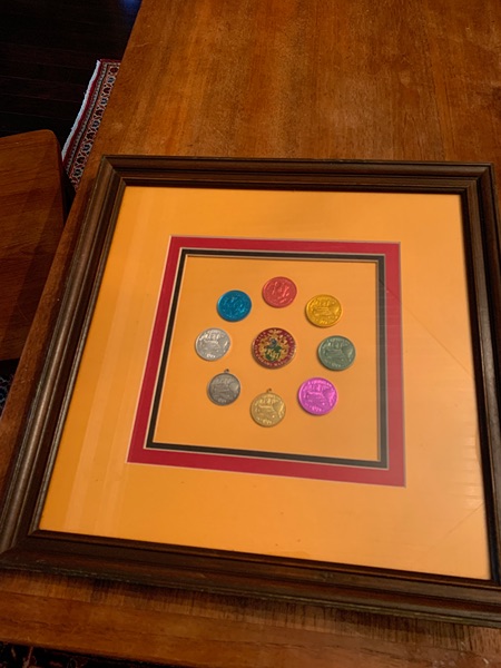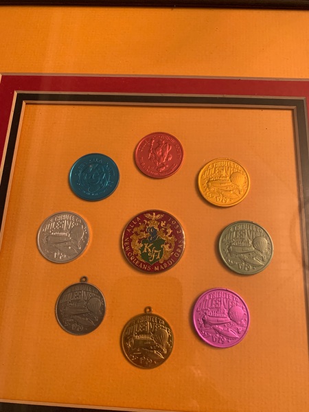 For sale is a collection of authentic New Orleans Mardi Gras doubloons. Framed in wood with double matting by Frame City & Gallery (New Orleans, Metairie, and Gretna) and measuring 15" x 15", it features eight single colored aluminum doubloons, including two with a loop, surrounding one sealed multicolor Heavy Doubloon in the center. All from 1979 by the Krewe of Alla and honoring the French author Jules Vernes, they appear to be in excellent "non-thrown" condition. Merci Beaucoup.