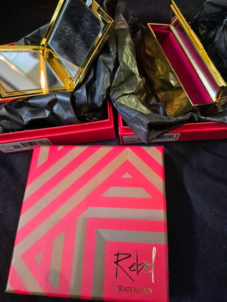 Gold colored studded compact mirror (with magnification) -- and lipstick case. Made by Waterford. Never used, like new. Both in box. Set costs $130 elsewhere. Great gift for Mom at an awesome price. Cash.