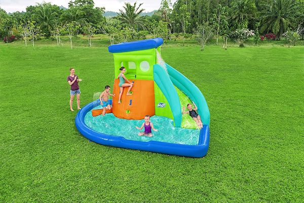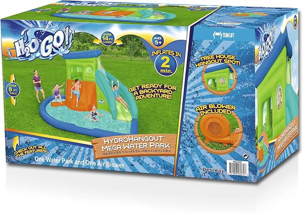 Bestway H2OGO! Hydro Hangout Kids Inflatable Water Park | Outdoor Slide, Climbing Wall, Splash Pool, Sprinkler. The size of this backyard inflatable is 14 ft. 8 in. x 10 ft. 11 in. x 8 ft. 5 in., and is appropriate for children ages 5 and up. Amazon $349
