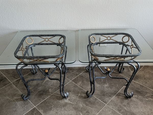Set of 2 end tables. Silver and gold with glass top. Excellent condition. Cash only.