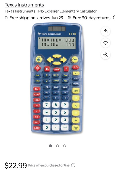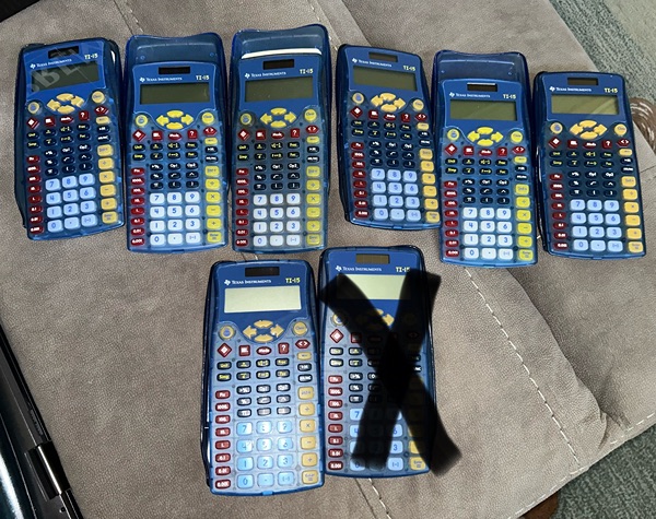 Blue Texas Instruments TI-15 Explorer Elementary Calculators. These are in very good working condition from smoke free home. They cost around $25 each new; asking $5 each or $30 if you want all 7 remaining units. There's a model guide for teachers as well as a quick reference guide available on the Texas Instruments website.