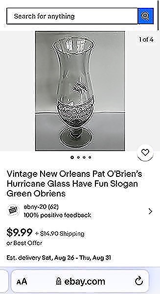 Pat O’Brien’s New Orleans, LA Hurricane glass- great condition…$10 firm ($5, if you purchase both!)