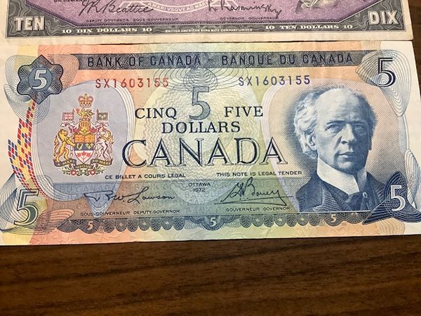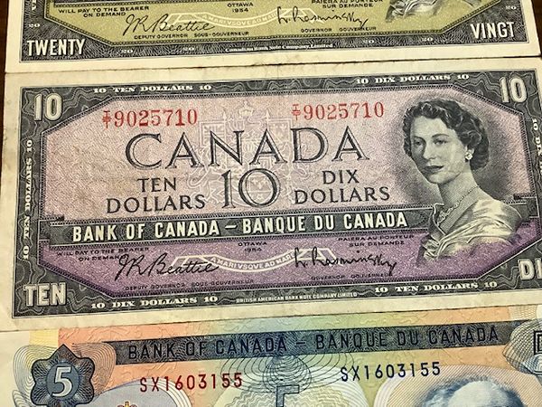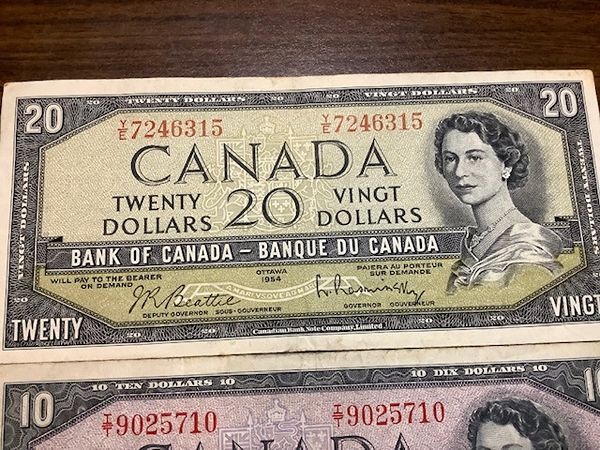 Canadian Banknotes $5, $10 & $20 Paper Bills 1972, 1954 & 1954