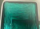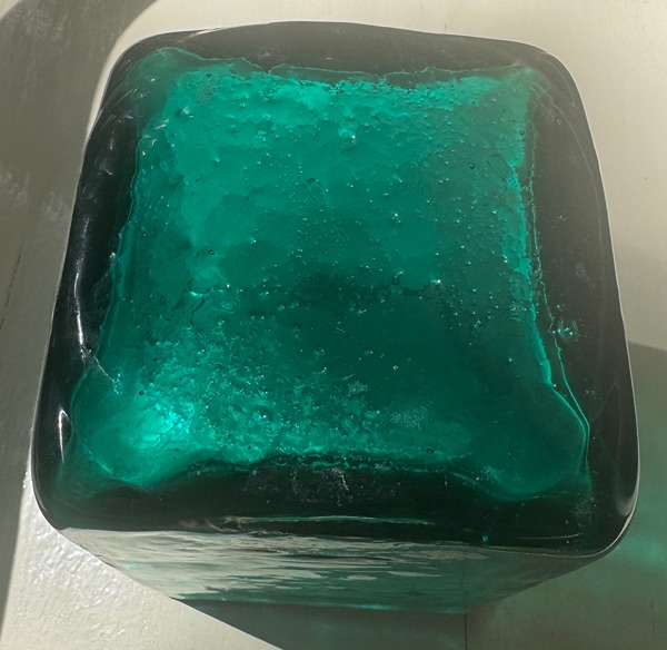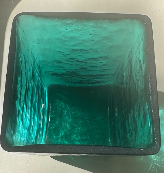 This appears to be a hand-blown square vase made from recycled glass, characterized by its teal green color, thick walls, and intentional bubbly or "seeded" texture inside the glass—a common feature in artisan pieces from makers like Vidrios San Miguel (a Spanish company specializing in 100% recycled glassware). These vases are often produced in Mexico or Spain using traditional blowing techniques, resulting in the wavy, imperfect surface and air bubbles trapped within the material. It's likely decorative, suitable for flowers, plants, or display as is.