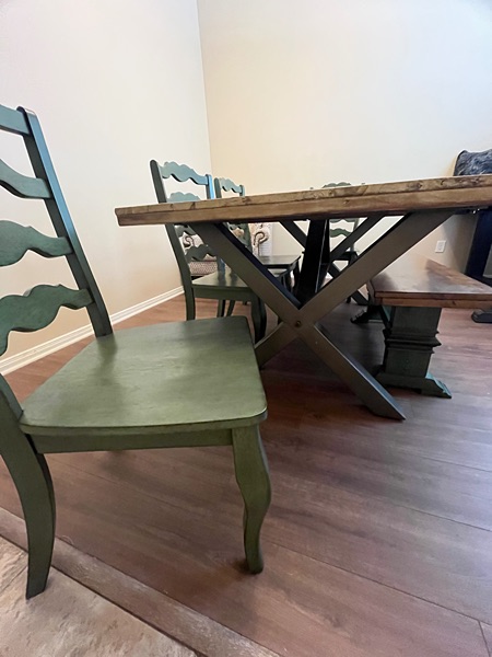 Reclaimed wood dining table originally purchased from Laurie's in Tomball. 4 sage color chairs and matching bench. Excellent used condition.
