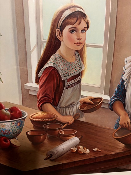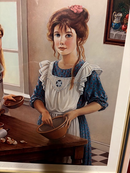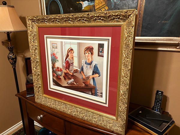 The art work depicts two young women in a kitchen setting, engaged in the activity of baking, with ingredients like apples and a rolling pin visible on a table. Pati Bannister is known for her romantic and nostalgic art, often featuring young women and themes of childhood or domestic life. The ART work comes with a matted fantastic frame in pristine condition. Produced in 1990, this contemporary piece reflects the style of illustration art and is an original print from the United States. The artwork is a unique and collectible item that would make a lovely addition to any art lover's collection.