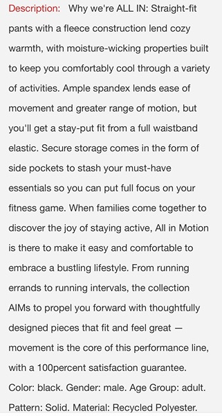Men's All in Motion brand, straight fit fleece pants, size XXL. These are moisture wicking with full elastic waistband and zip side pockets. They are new with tags from smoke free home. $15