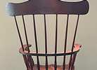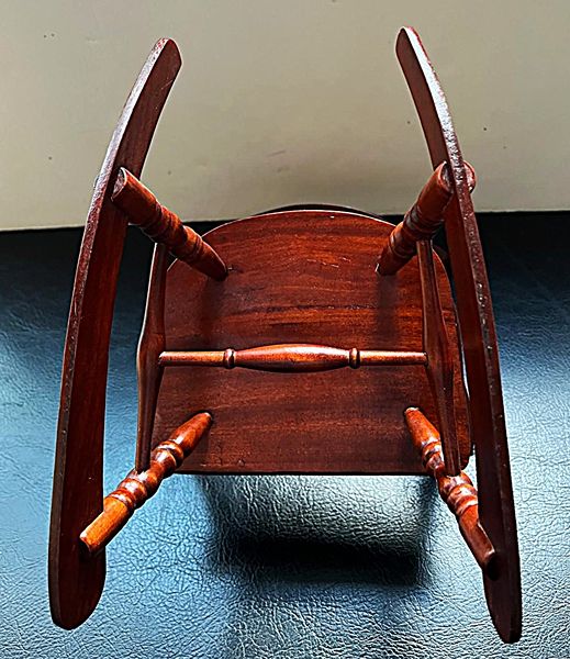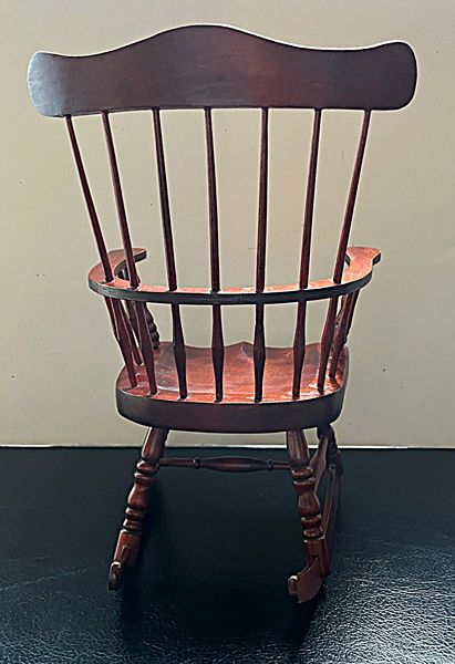 Rocking chair for 18-inch, or smaller, doll or stuffed animal. It is a Windsor style and solid wood. It has a cherry wood finish and measures 13" high x 8-1/4" wide. The seat itself is 5-1/4 wide and 5" deep. Was originally purchased for an American Girl doll.