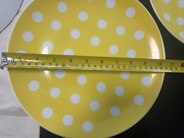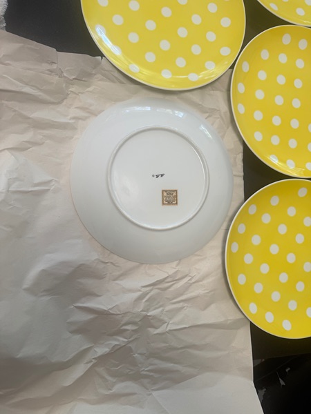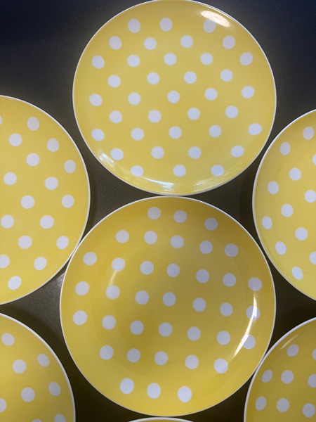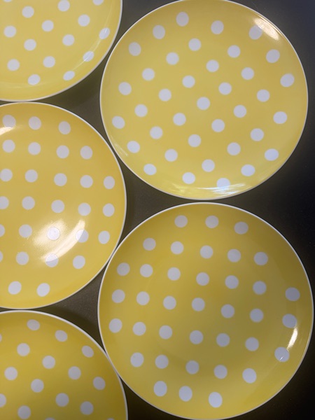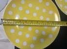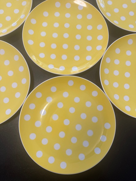 This is a dinner plate (10.5in) from the discontinued Fitz & Floyd “Polka Dots” pattern (white dots on yellow background), made of hand-painted earthenware in the 1970s or 1980s. The “FF” stamp and the label on the back match this classic design.