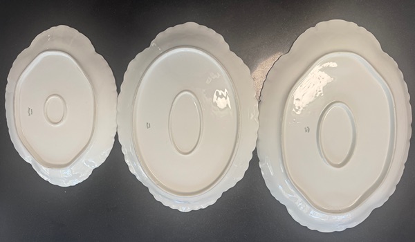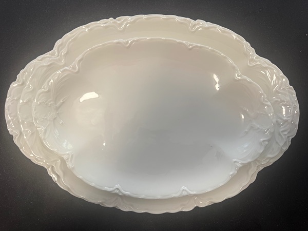 These three Haviland France serving dishes are oval platters from the Ranson pattern (also known as Schlesinger #1), a classic all-white, scalloped-edge design produced by Haviland & Co. in Limoges, France, typically dating from the late 19th to early 20th century. They are in excellent condition based on the provided photos, with no visible chips, cracks, or significant wear.