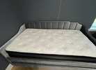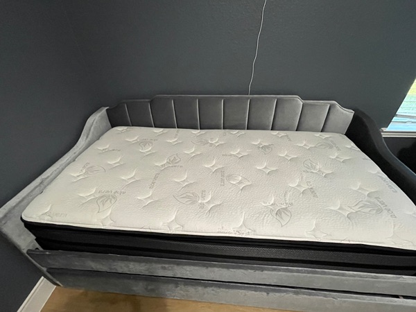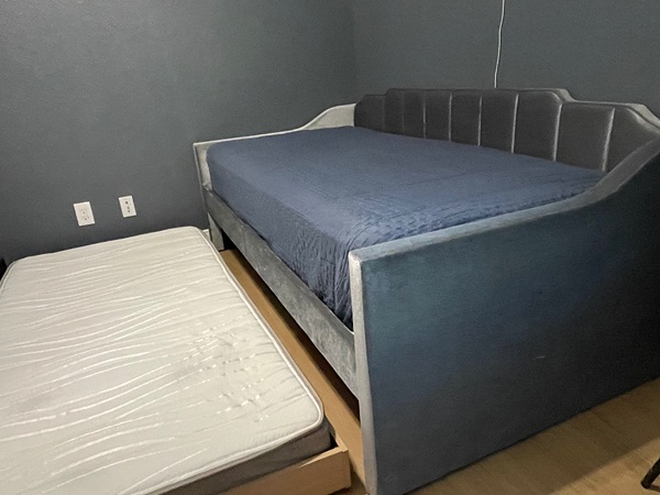 Includes 2 like new mattresses. Gray velvet upholstery, Used in guest room only slept on a handful of times. Excellent condition