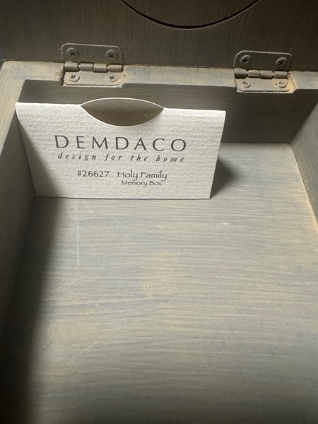The Willow Tree “Holy Family” Memory Box (#26627), designed by Susan Lordi and produced by DEMDACO in 2006, is a retired item that’s still available through secondary markets and some remaining stock