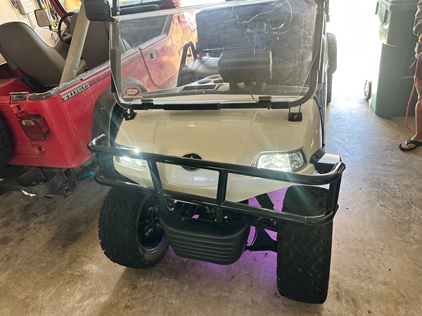 Six seater, lithium battery with charger, Bluetooth radio, back up camera with color display, 4inch lifted suspension, off road tires LED lighting under carriage with remote. LED headlights and taillights with blinkers and brake lights. Garage kept