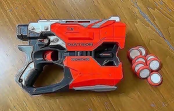Are you ready to bring some multi-shot madness to your next mission? The Diatron blaster lets you send two discs hurtling toward your target at the same time with every shot. Firing this fast is no problem, because the blaster's built-in drop-down magazine snaps open for fast, easy reloading. The Nerf blaster's Tactical Rail is compatible with any Tactical Rail accessory (sold separately), so you can upgrade at will for even more strategic advantage. The XLR Disc Tech Nerf Gun Blaster hurls the bright orange Vortex discs an ultra-long distance, with twice the firepower and twice the disc blasting action. Assembled Product Dimensions (L× W x H)