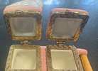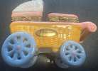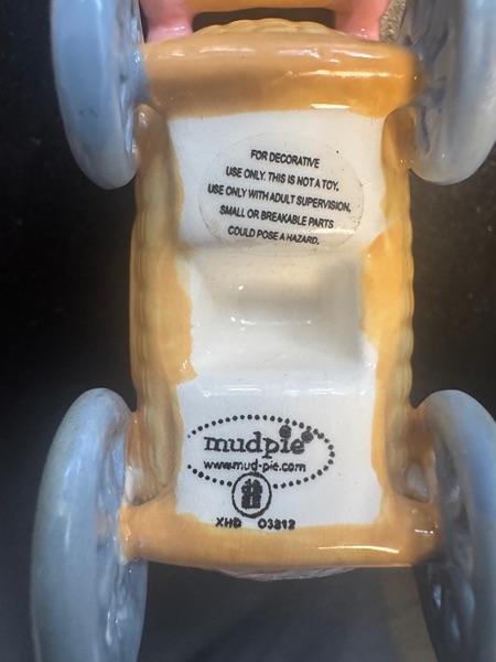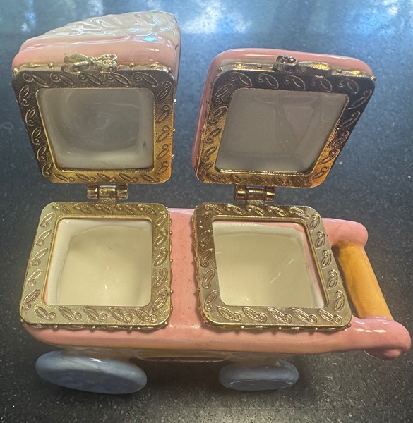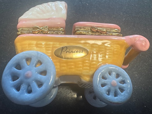 This is a Mud Pie “Little Princess Baby Buggy” double-hinged ceramic treasure box, designed as a decorative keepsake for storing a baby’s first tooth and first curl. It’s hand-painted with a wicker-style yellow carriage body, pink accents and canopy, blue wheels, gold trim details, and engraved sentiments on the compartments. The model appears to match item references from around 2010-2016, when it retailed for $19-20 at stores like Amazon