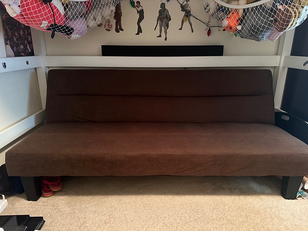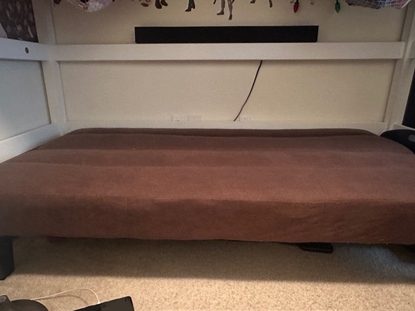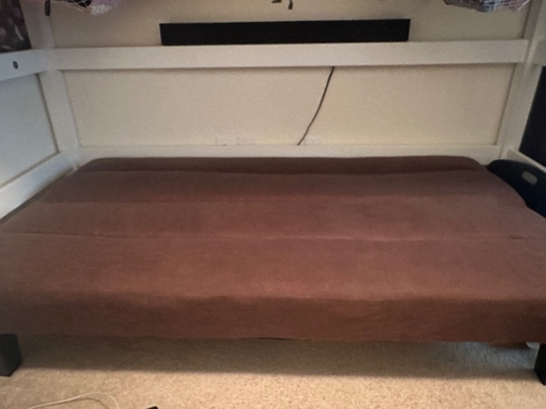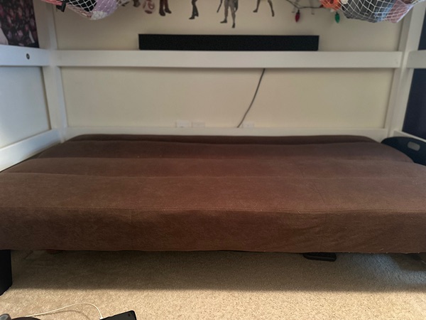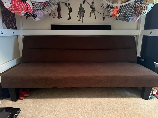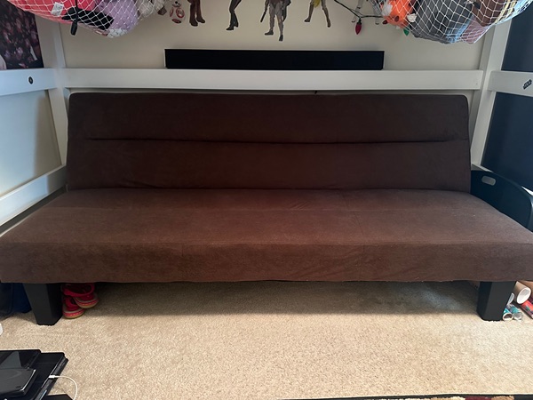 Comfortable brown futon sofa, perfect for any room, gently used. I need to replace it with a desk for my son’s room. Porch pick up only.